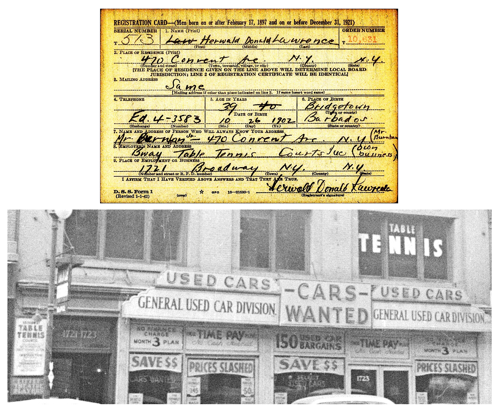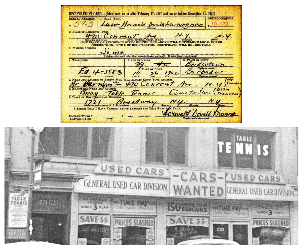 The rest of the story: Not only were there Jewish gangsters and Jewish boxers in early- to mid-20th-century New York City, there were Jewish ping-pong champions as well. An ecosystem of Runyonesque characters populated table tennis parlors, just as they hung around boxing gyms and pool halls. Gambling and hustling was the name of the game, and players like Marty Reisman, Sol Schiff and Dick Miles were the real deal. A striking number of the best players were from the Upper West Side, and according to Miles, who won the U.S. championship 10 times, “In the late ’30’s, early ’40’s, it was possible to find as many as 1-2-3-4 table tennis clubs located up and down Broadway from 54th to 96th streets”. You can find them in the photos taken by the city in 1940 to document buildings for tax-assessment purposes. As Dick Miles noted, the string of tennis table centers started at 1721 Broadway between West 54th and 55th Streets (let’s grandfather it into the UWS for this purpose), called the Broadway Table Tennis Courts. It was owned in the 1940s and 50s by a Barbadian expat named Herwald Lawrence, and The New Yorker noted in 1942 that Lawrence’s was where “most of the experts in New York hang out,” and it was there that tween Marty Reisman stepped up to big-time table tennis.