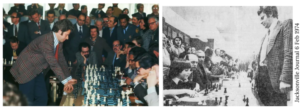 Shoutout to readers: Many of you really know your second floors! The location of the Woolworth’s between 91st and 92nd fooled some of you because the façade and lettering was nearly identical to that of the Woolworth’s at 79th and Broadway, That’s why I gave you the distinctive pediment and a little bit of the building next door as clues. A number of readers recognized the Riverside Theater at 96th and Broadway, where Marty Reisman held court through the 1960s and early 1970s at his ping pong club downstairs. Elgin93 added a splendid memory of seeing Boris Spassky simultaneously play 40 opponents in the Chess City at that location in February 1974. Elgin, recognize anyone in these photos of that event?