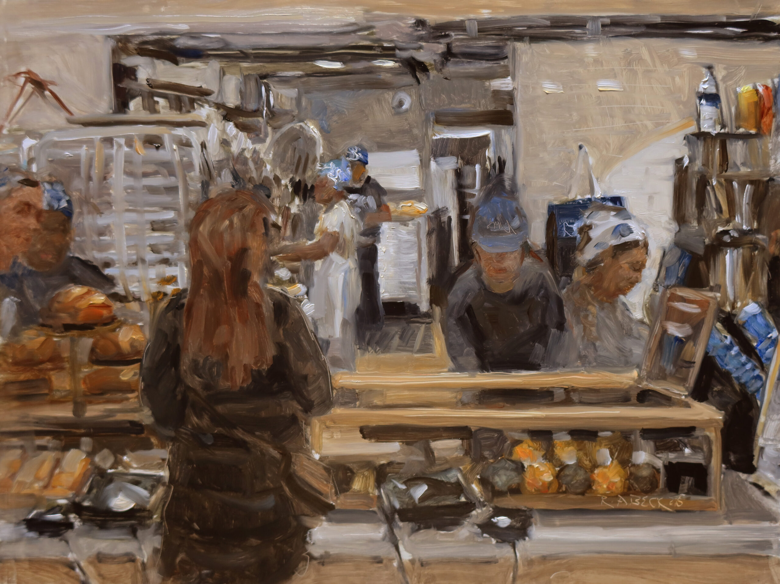 It got tight in there. Customers were negotiating their arrivals and departures, tossing scarves over their shoulders, checking their pastry bags with their elbows out, and at times, we were very close. I had to paint defensively, switching brush hands and using my left arm for protection. I hang a reflective construction vest on my easel to catch people’s eyes, but it’s not effective in a packed room, and sometimes I have to stop painting to make sure no contact is made. People aren’t looking out for an easel with a wet painting and palette; they’re looking for a chocolate chip walnut cookie.