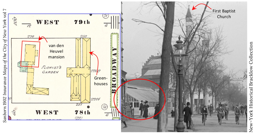 The rest of the story: They don’t make ‘em like they used to. The van den Heuvel mansion was constructed of stone with floors supported by “great beams of black oak.” Its four prominent columns at the front door were “white cedar hewn from logs of trees grown on the estate.” Its 18th-century interior was lavish in materials and detail with expensive custom-built furniture. Tom Miller described the house’s history and contents in a Daytonian in Manhattan column a decade ago. Given the house’s prominent location on the Bloomingdale Road and its long life as a genteel hotel or inn long after the original owners sold it, it’s surprising that no one is sure who built it! Jan van den Heuvel, its most famous early owner, has long been credited with arranging its construction, but the dates don’t work: If the house was built around 1759 and housed both British troops and George Washington himself during the American Revolution, then it could hardly have been built by van den Heuvel, who was a Dutch colonial governor in South America and only arrived in New York in 1790. Charles Apthorpe, part of whose estate was purchased by van den Heuvel’s wife in 1792, already had an impressive mansion nearby. The van den Heuvel mansion’s distinctive rectangular appearance is misleading—a mid-19th century fire destroyed the top floor, and the gabled top floor was replaced with the one seen in photographs. The story of the mansion’s ownership by the feuding Astor family is well-known, as is its demolition and replacement by the Apthorp apartment house. Solidly built as it was, the mansion could probably have stood for another 150 years. An interesting chapter late in the building’s life was its tenancy by the Clarke family of florists. They lived in the mansion and built an extensive set of greenhouses to supply their cut flower business. This led to the incongruous sight of glass buildings along busy Broadway until the first years of the 20th century. Family member Gilmore Clarke became the first professor of city and regional planning at Cornell University and as consulting landscape architect for the Parks Department, was responsible for many elements of New York City’s public landscape: Bryant Park! JFK Airport! Even the design of our park benches! Learn more in Tom Campanella’s new book The Public Landscapes of Clarke and Rapuano, 1915-1965.