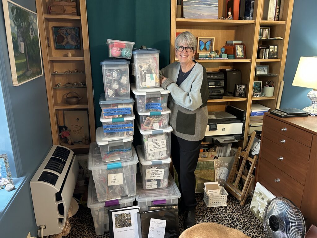 “I began taking the photos and ornaments home after the season was over. I would dry them out and try to tape them up. Years later, around 2022, I started laminating them,” Larsen told West Side Rag during an interview at her home. “A lot of people assumed the photos and ornaments would just disappear and be thrown away each year, which seemed bizarre to me. I don’t know if anyone would ever come and pick them up besides us, but we did.”