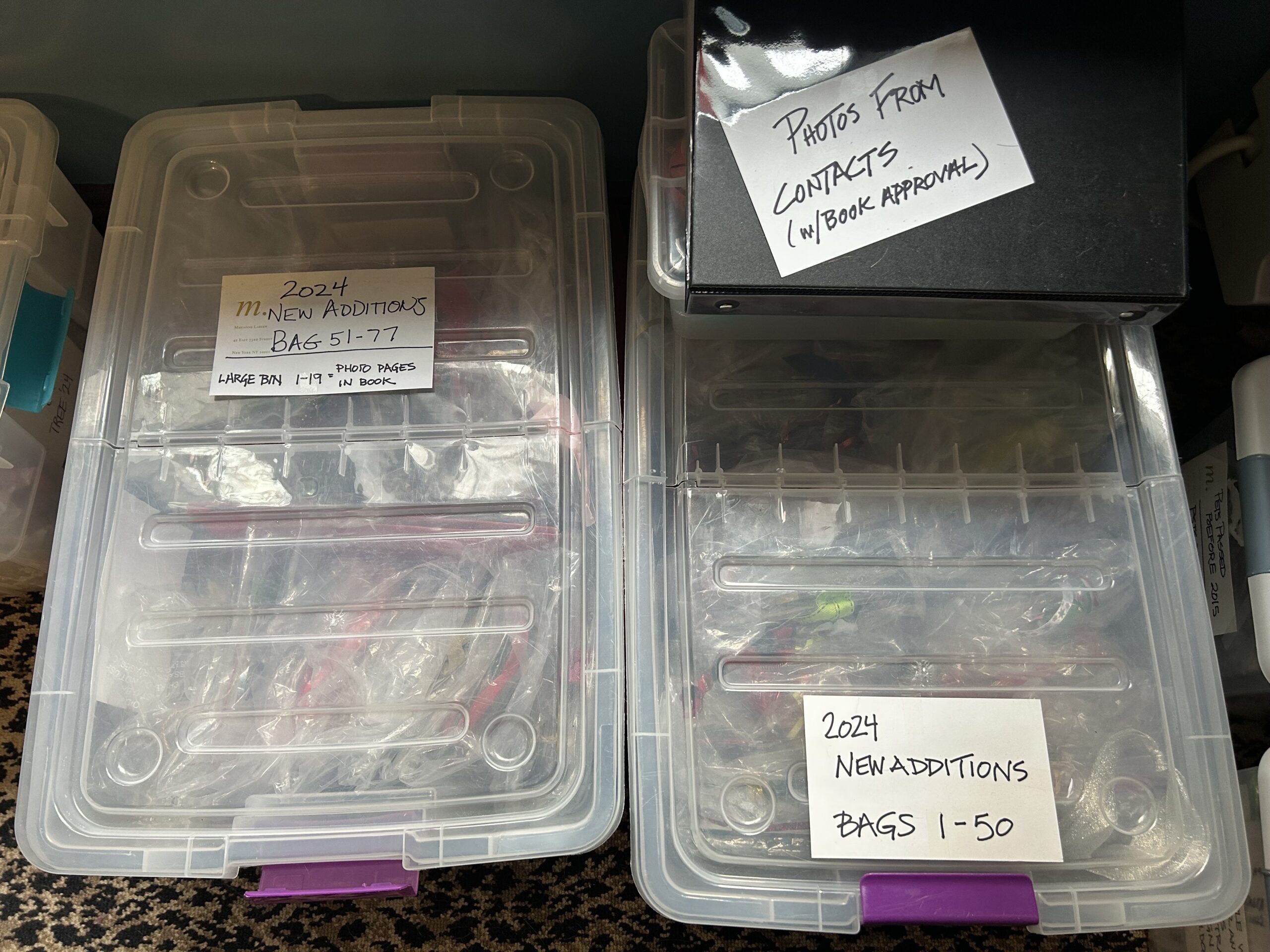 Larsen has spent countless hours organizing the photos in plastic bins and boxes with a corresponding binder.