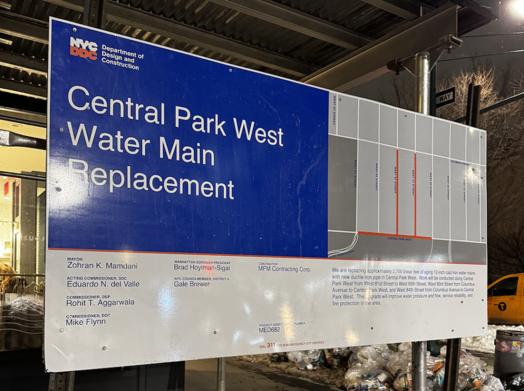 The city is replacing 2,700 feet of 12-inch cast-iron water main pipes that date back to the 1870s, from West 81st to 85th streets, along Central Park West, as well as on West 83rd and 84th streets, between Central Park West and Columbus.