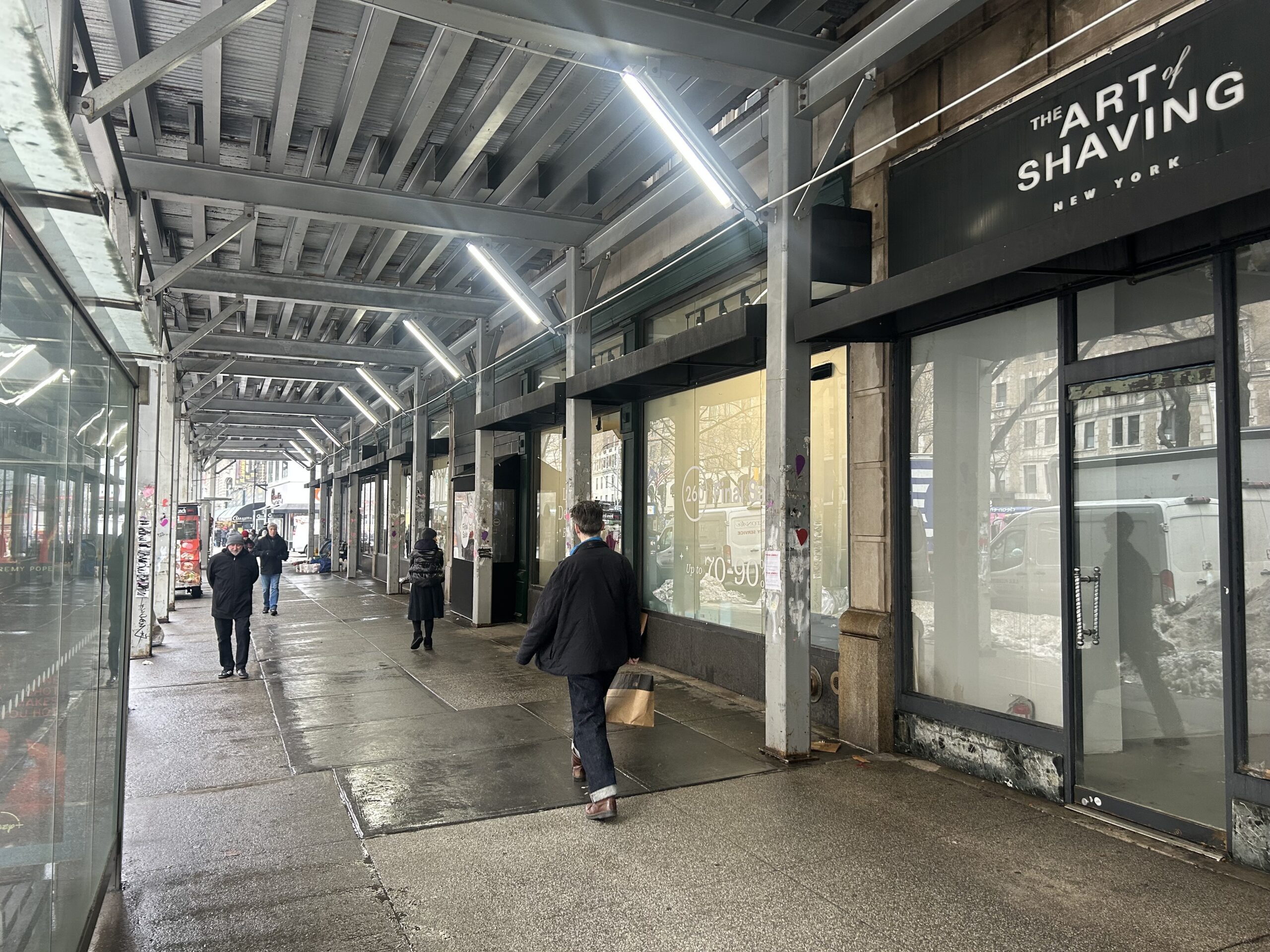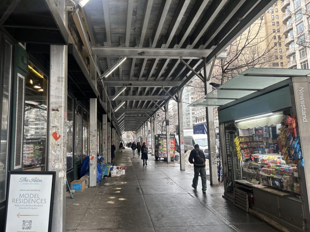 There are four commercial spaces on Broadway under the sidewalk shed at The Astor, between West 75th and 76th streets, and three of them are vacant. 260 Sample Sale is the lone business still operating on the street.