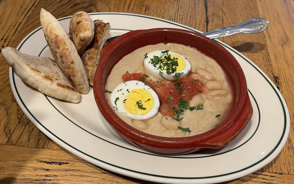 Of all the dishes I’ve covered for this column, Florentin’s white bean msabbaha might be most straightforward, no-fuss of them all, yet is super tasty and vibrant. This is a dish you can actually make at home; white beans (from dry, but canned is okay), tahini, lemon and olive oil are all you need. Toppings are up to you – Florentin adds crushed tomatoes, hard-boiled eggs and parsley – and a little creativity is allowed. Look carefully, and perhaps except for the tahini (which you can get anywhere, Trader Joe’s has a very decent one), you probably have everything you need in your kitchen, and this is your chance to make good use of that can of beans that has been hiding miserably in the back of your pantry.