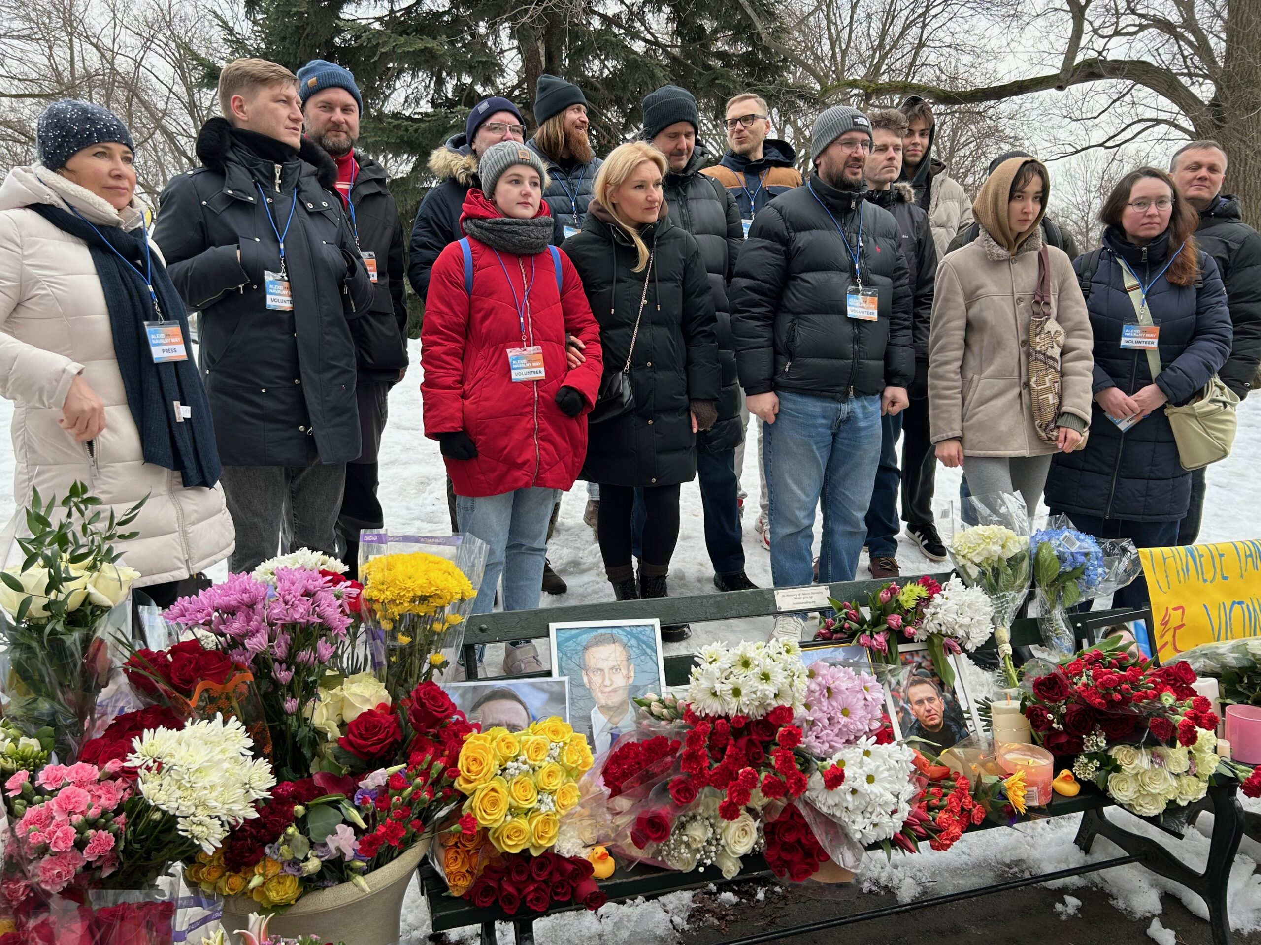 “With Central Park management we have an agreement to use a bench with a plaque in memory of Alexei as a permanent memorial,” organizers wrote in Russian on the group’s Facebook page. “Flowers and portraits of Navalny can be left there and they will remain there much longer than in the Russian consulate. We want more people to be able to see them and remember Alexei.”