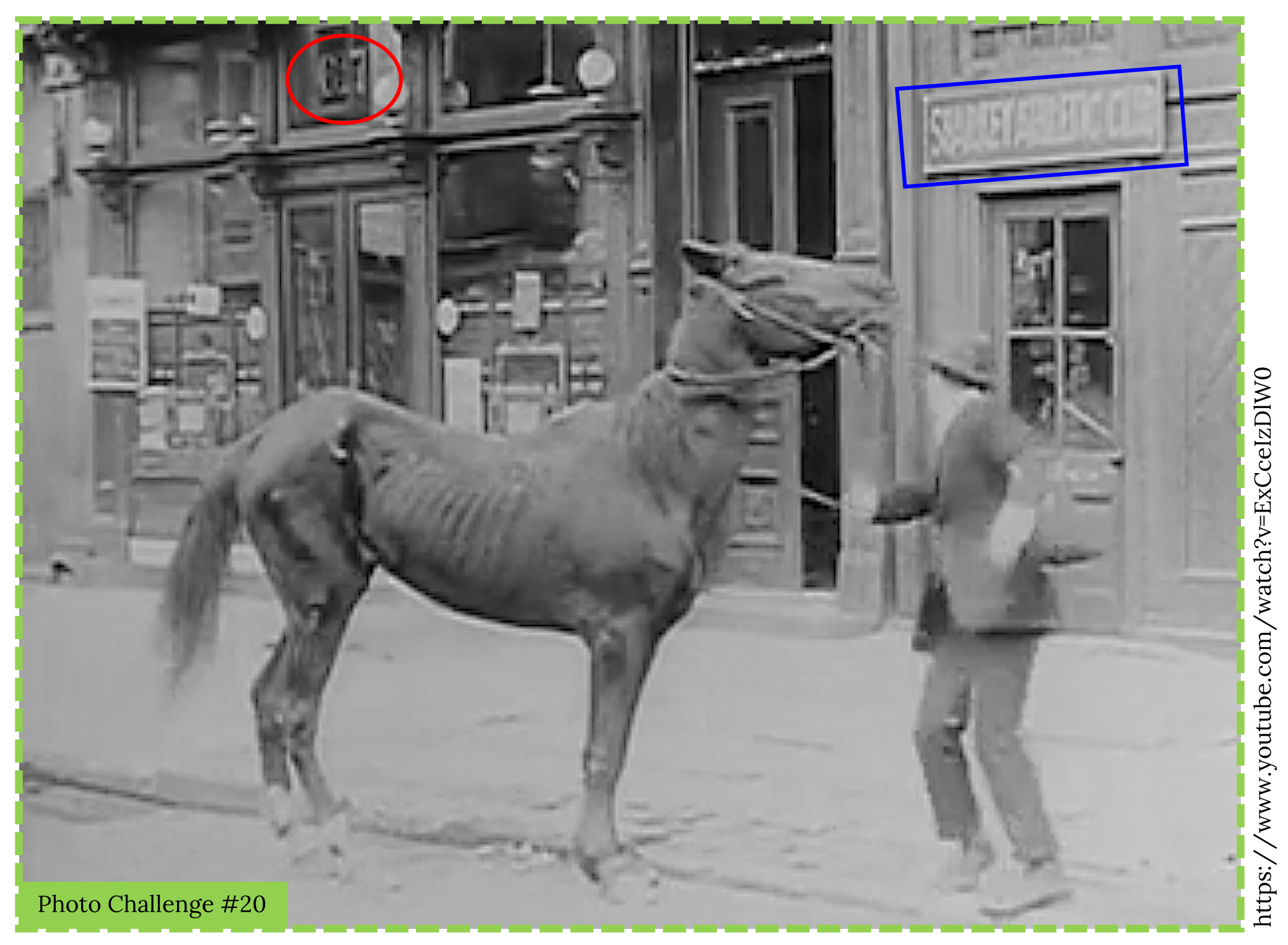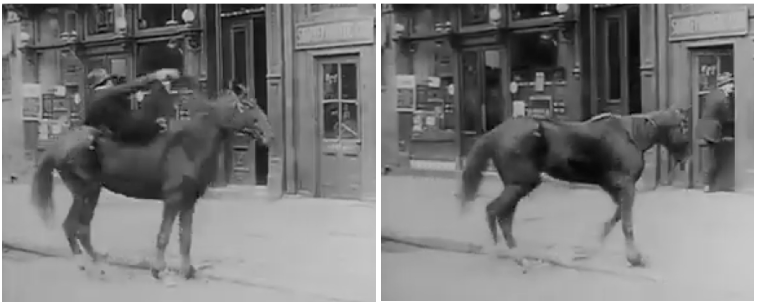Shoutout to readers: Sasha Charnin noticed the Sharkey’s sign and correctly linked it to the saloon/boxing venue on Columbus Avenue in the mid-60s. For readers concerned about the underfed appearance of the horse, here are screen grabs taken immediately before and immediately after Fairbanks dismounted—the horse’s ribs aren’t showing in these images, so perhaps his body was briefly turned at an angle that pressed his ribs against his skin and made him look emaciated.