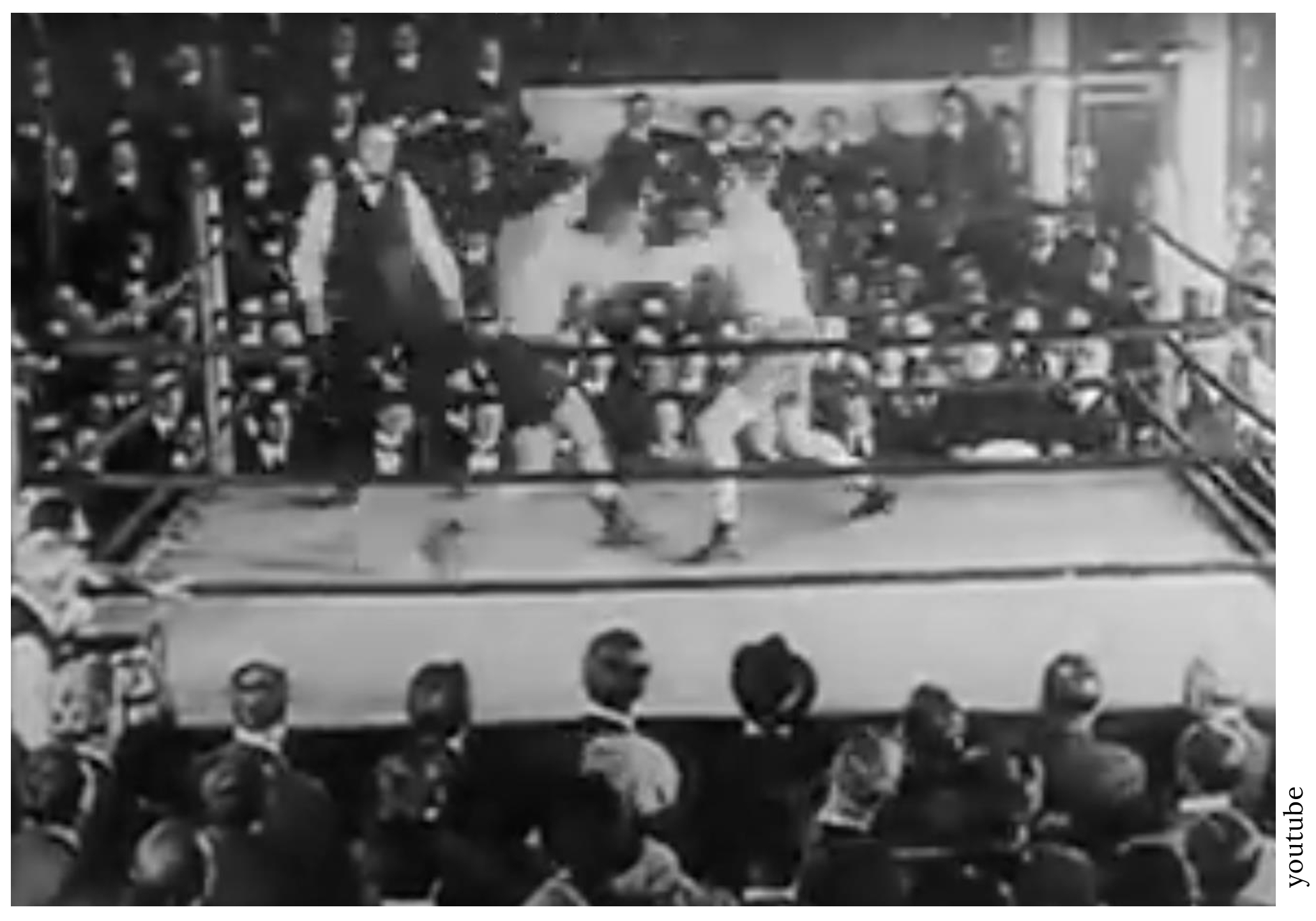 The rest of the story: In the early 1900s, prizefights were illegal in New York State. But there was a large loophole: Athletic clubs were allowed to stage boxing matches. So, saloons declared that they had an adjunct athletic-club business, and members could join at the door by paying not an admission but a membership fee. The result was a thriving boxing industry in New York City, and a cat-and-mouse relationship with the police department. One of the best-known such venues bore the name of Thomas J. “Sailor Tom” Sharkey. Tom Sharkey was a legitimate boxing legend: a 5’9” Irishman who joined the U.S. Navy, became its boxing champion, then fought professionally at the highest level for a decade. As his autobiography’s title says, “I Fought Them All.” Sharkey took on a Who’s Who of heavyweights during the golden age of American boxing, from James Jeffries to Gentleman Jim Corbett. He finished with a record of 37-7-6, with five of his seven losses coming in his last seven fights. Sharkey went into the liquor business in New York City after retiring from boxing, and lent his name to a saloon-cum-athletic club at 65th and Columbus, in the shadow of the El. Sharkey’s was a serious venue—it apparently held 600 fight fans and although Gene Tunney later called it “nothing more than a loft with tiers of wooden benches to the ceiling…an absolute fire-trap,” a scene from Douglas Fairbank’s movie His Picture in the Papers shows a legitimate-looking arena.