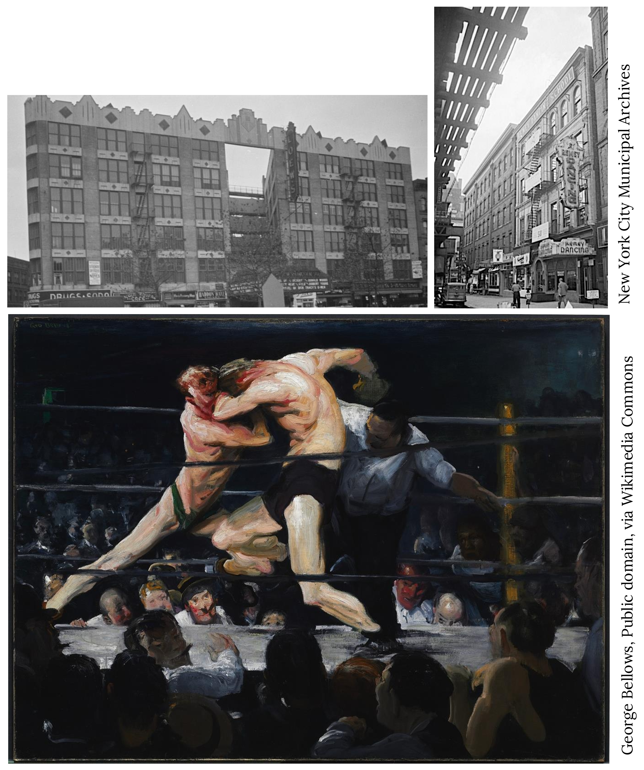 Wait–there’s more! Across Broadway from Sharkey’s was Lincoln Arcade, which provided rooms and studios for artists ranging from Marcel Duchamp and Eugene O’Neill to Ashcan School painter George Bellows. Bellows attended the fights at Sharkey’s, and what is arguably his best-known painting, Stag at Sharkey’s, is set there.