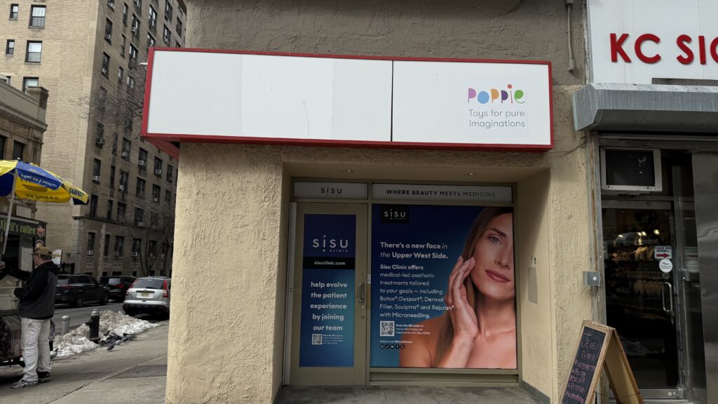 Sisu Clinic, a skin care clinic has signage up on the corner of Broadway and West 83rd Street. It is expected to open in May, CEO Pat Phelan wrote to West Side Rag in an email. “Sisu Clinic was founded to make high quality, doctor-led, aesthetic treatments accessible, ethical and results driven,” Phelan wrote. “We combine medical expertise with a modern patient first approach to cosmetic treatments.” The clinic specializes in non-surgical aesthetics such as botox, filler, brow lifts, and microneedling. Other NYC locations are on the Upper East Side, Flatiron, and SoHo. They also have locations in Houston and Miami. Poppie Toys, the pop-up, was previously in the space. (Thanks to Mia for the tip.)