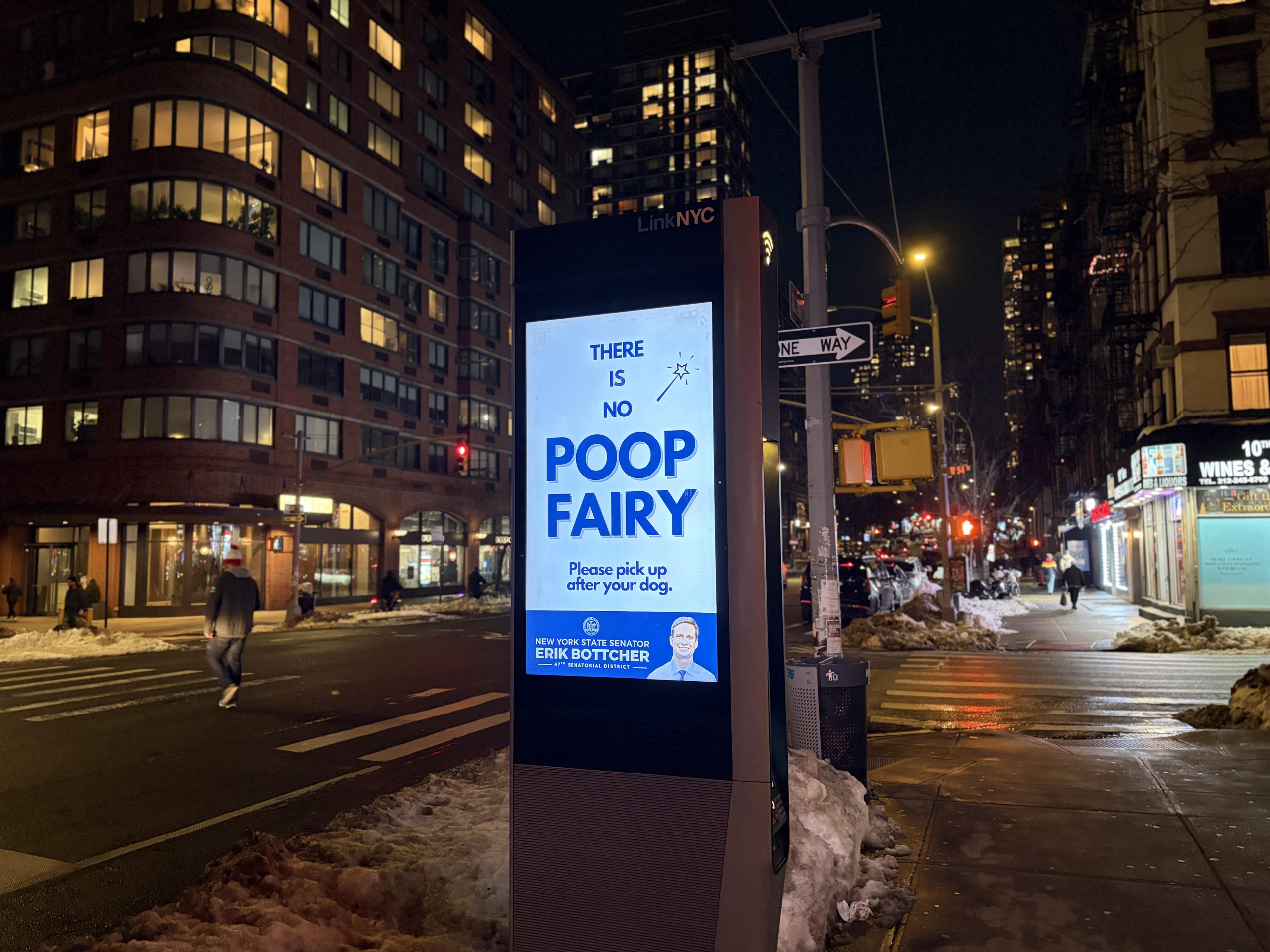 Bottcher: The poop fairy campaign is something that’s been done around the country in various forms for many years, and bringing it to New York has hopefully helped people think twice about their behavior. It’s been a huge success. By spreading the message on Link kiosks and elsewhere, it’s gotten people talking about it.