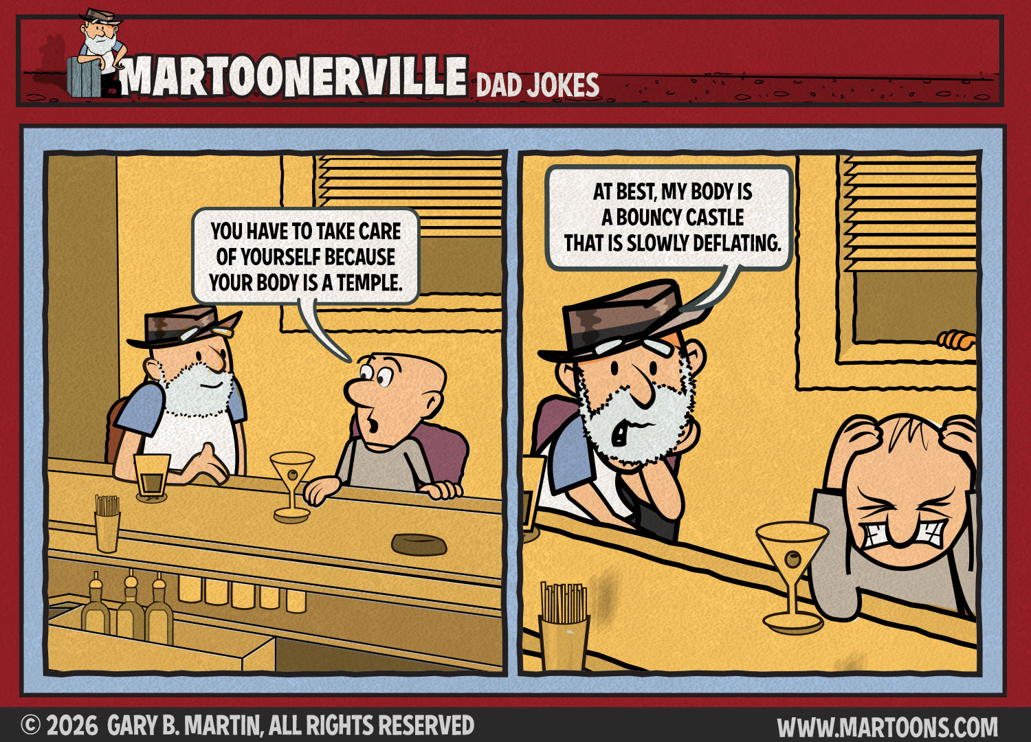 Really love the self-referential “Dad Jokes” in your Martoonerville header, but even better is how you snuck in a hand about to climb in the window in that second panel. Sometimes you have to look for an extra second or two at your cartoon to see those Easter eggs. Just what is happening in that window, Gary?