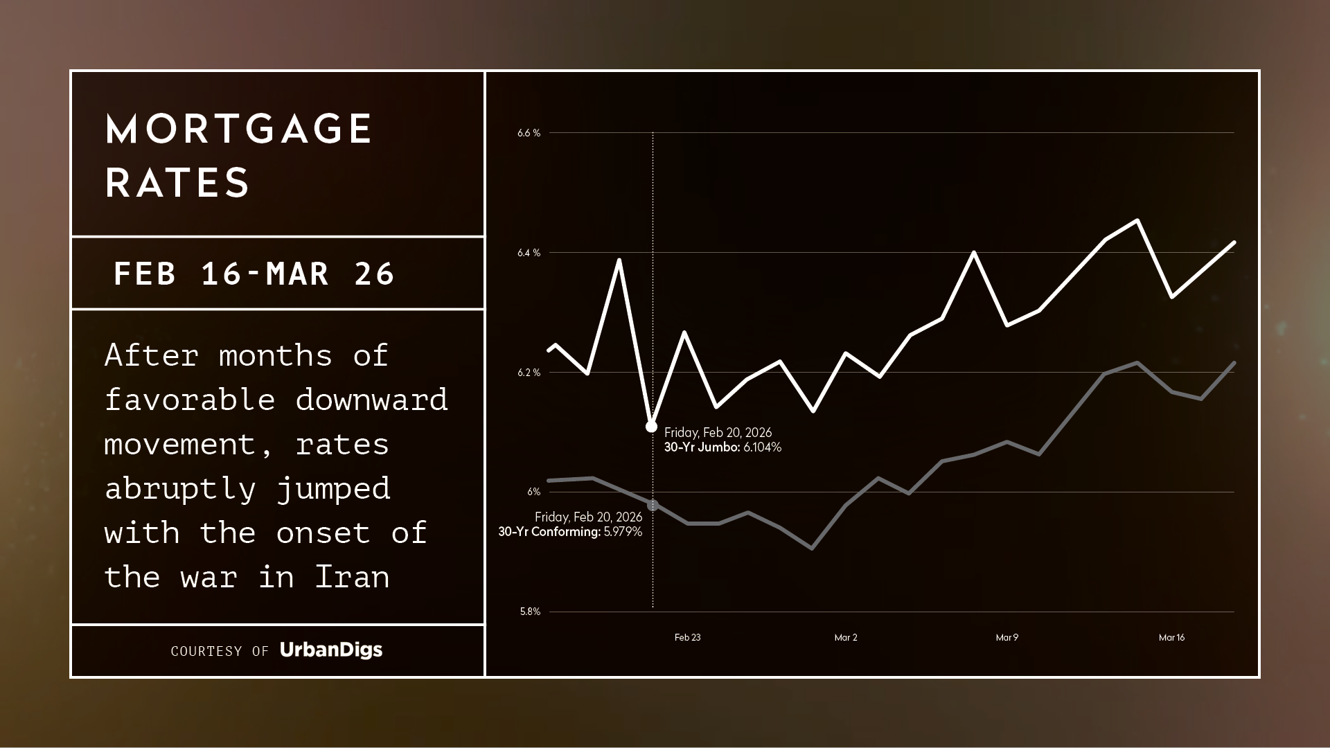 I ask because, virtually every time over the past 6-7 years (excluding the rubber-band effect we had post-pandemic in 2021), the market surges we had anticipated at the time got tripped up by SOMETHING. In 2019, it was The Housing Stability and Tenant Protection Act of 2019 (a big name for “what a disaster”); then in 2020 it was the pandemic; (2021 was the snap-back like something we will never see again); in 2022 it was the war in Ukraine, followed immediately by the beginnings of the spike in interest rate; in 2023 it was the Regional Banking crisis and rates that were still rising (up to 8% in Oct 2023); 2024 was simply the continued malaise of sticky 7% rates; 2025 was Liberation Day and now in 2026…the moment we hit 6% on the 30 year jumbo mortgage and sub-6% for the conforming, here comes the war in Iran, causing rates to abruptly reverse course and pop up several points.