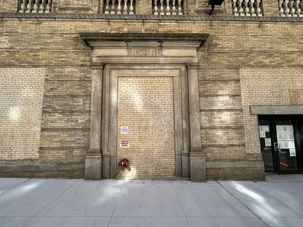 “I’m hoping you or your readers can help solve a mystery that has nagged at my family for years,” Upper West Sider David Leslie wrote to the Rag. “There is a bricked-up entryway on the 83rd Street side of 2299 Broadway — i.e., the Harry’s Shoes building — with ‘Leslie.’ (period included) inscribed in the stone arch above. Leslie is my family’s surname, and I’ve tried in vain to learn more about the history of the building in hopes of turning this into an anecdote for my kids.”