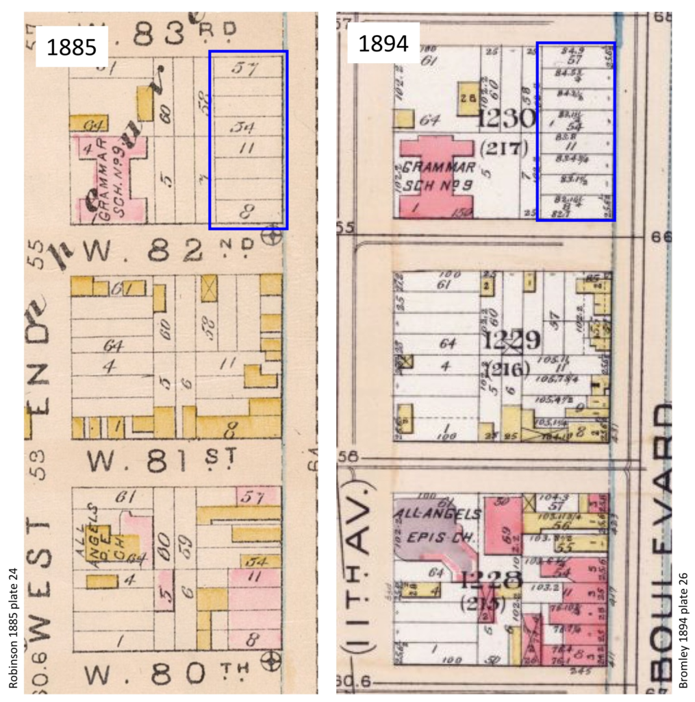 The west side of Broadway from 82nd to 83rd Street was devoid of structures until the 1890s. Throughout much of the 19th century, land on the Upper West Side remained largely undeveloped. Many pieces of property changed hands repeatedly, with investors and speculators anticipating rising property values as the city inexorably developed northward. An 1885 map shows the blockfront composed of eight lots, and all eight, plus six adjacent lots facing 82nd and 83rd Streets, were sold for a total of $120,000 in December 1887. As late as 1894, a fire insurance map still showed no structures at all along the block, even as the surrounding neighborhood began to fill in with buildings.