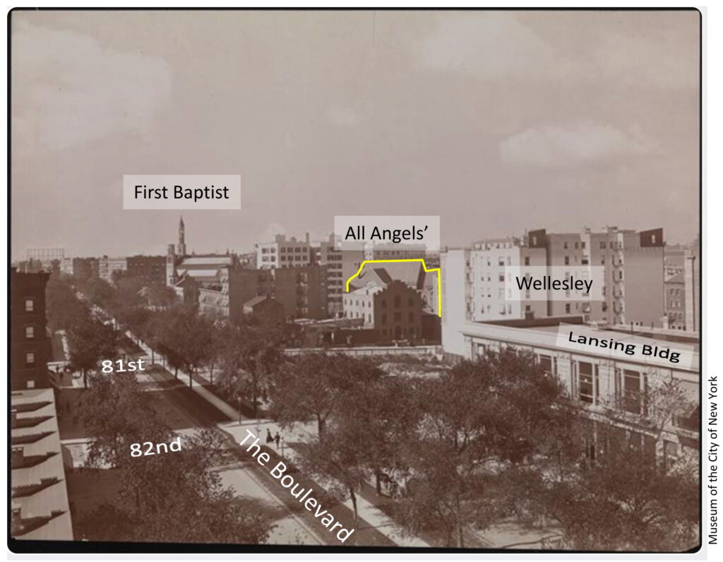 Looking south across Broadway, probably at the very end of the 19th century. The Lansing and Wellesley buildings were brand-new. A piece of All Angels’ is visible on the northwest corner of West End Ave and 81st, as are the asymmetric spires of First Baptist Church at Broadway and 79th.