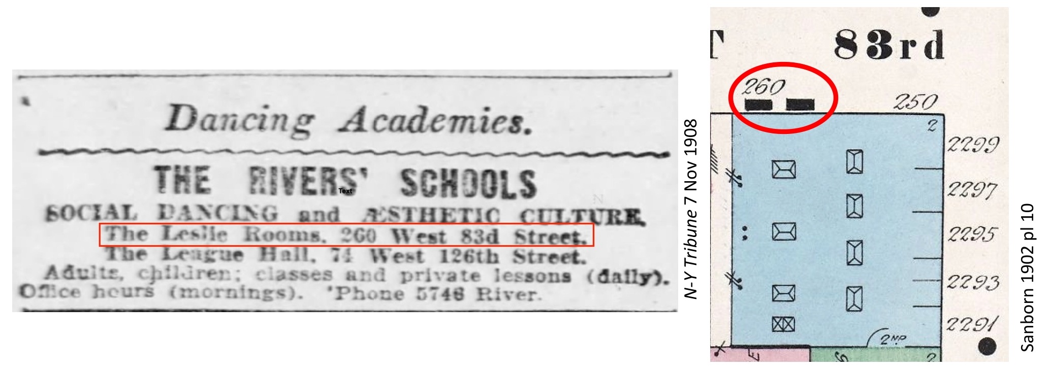 Events advertised at Leslie Hall used the street address 260 West 83rd Street rather than a Broadway address, suggesting that the entrance on West 83rd that retains the LESLIE sign over the bricked-up door was the main entrance in the early 1900s.