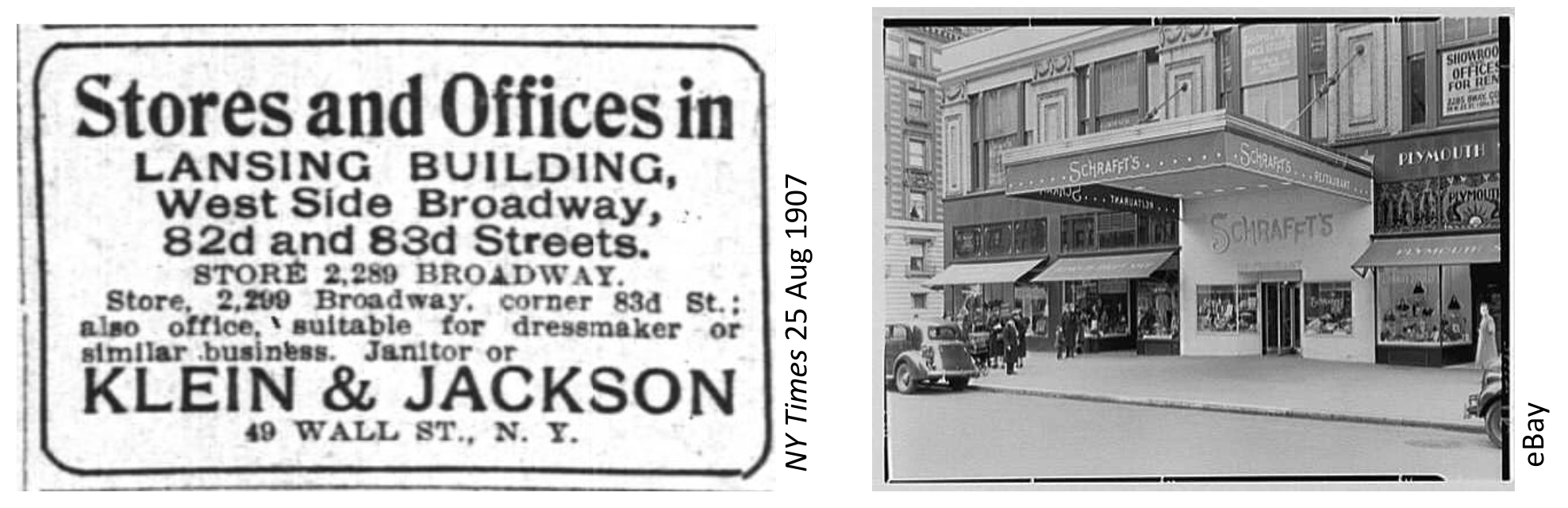 It’s not clear whether Leslie sometimes referred to the entire building or only to the upper floor. As early as 1905, newspaper ads for businesses described the addresses from 2281 to 2299 Broadway as the Lansing Building. Several real estate brokers had offices in the Lansing Building, and Schrafft’s, a candy counter and lunch spot, was notable among the retail tenants.