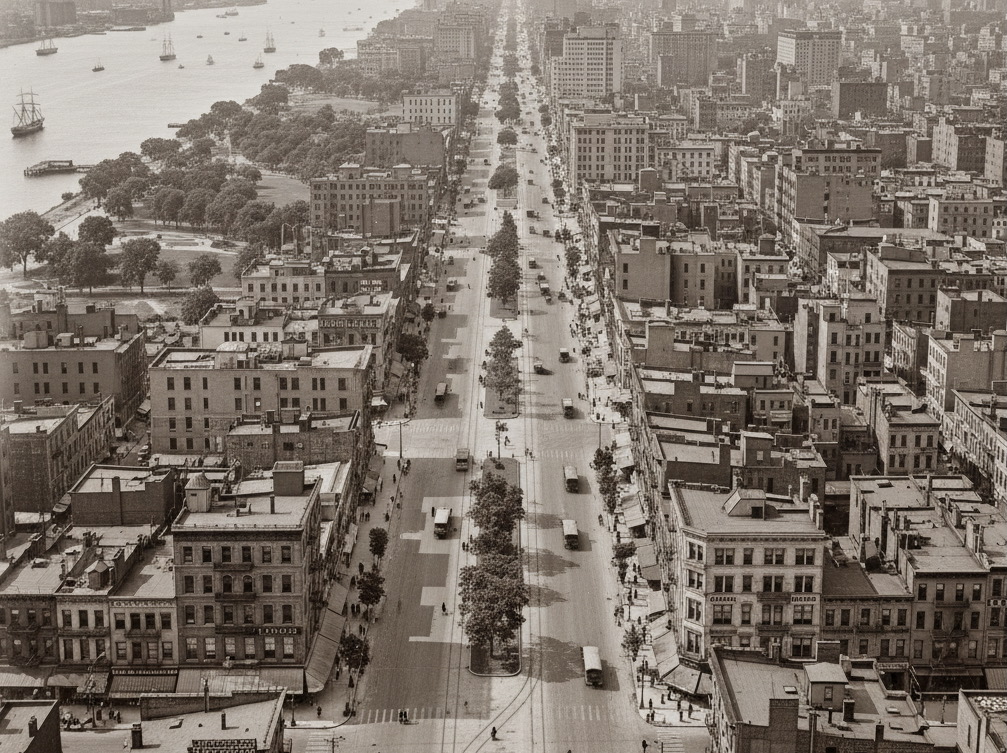 The Broadway scene was a bit more convincing, I thought. The buildings are low enough and the street traffic sparse enough that this could be from before 1900, in which case you wouldn’t expect a wall of 15-story buildings along West End Avenue or Riverside Drive, so that was plausible. But there’s something wrong with Riverside Park—too flat, too broken up. And where would WEA run into the park the way it does in this image? There’s a cross street in the foreground, but even though there are regular breaks in the center island, the cross streets never quite materialize as you scan uptown. The more you look, the more the scene becomes generic, like the streetcar-ish vehicles.