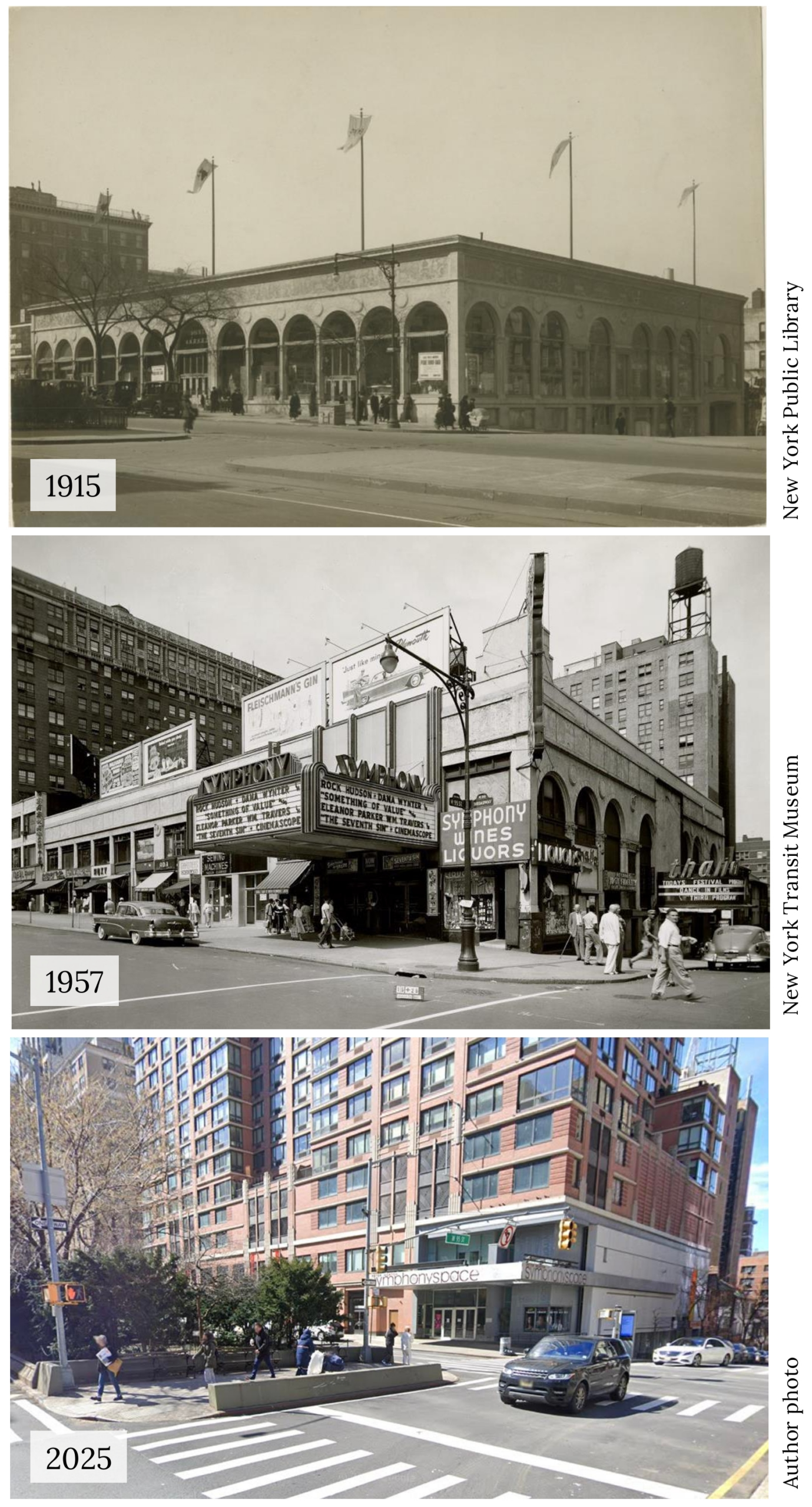 Clues: The photo showed a large but low building running along what looks like a major thoroughfare on the Upper West Side, probably Broadway. The cross-street slopes noticeably down to the right, which hints that we’re looking west towards the Hudson. That probably wasn’t enough to identify the building unless you remember Symphony Space before 2001, when it sold its air rights to a developer and was incorporated into the new Lyric apartment building. In its latter years as a standalone structure, the part of Symphony Space that faced West 95th Street still contained original arches from the building’s construction in 1915, although a decorative frieze above the arches appears to have been lost much earlier. The name “95th Street Market” is visible above the mid-block front entrance, but difficult to make out.