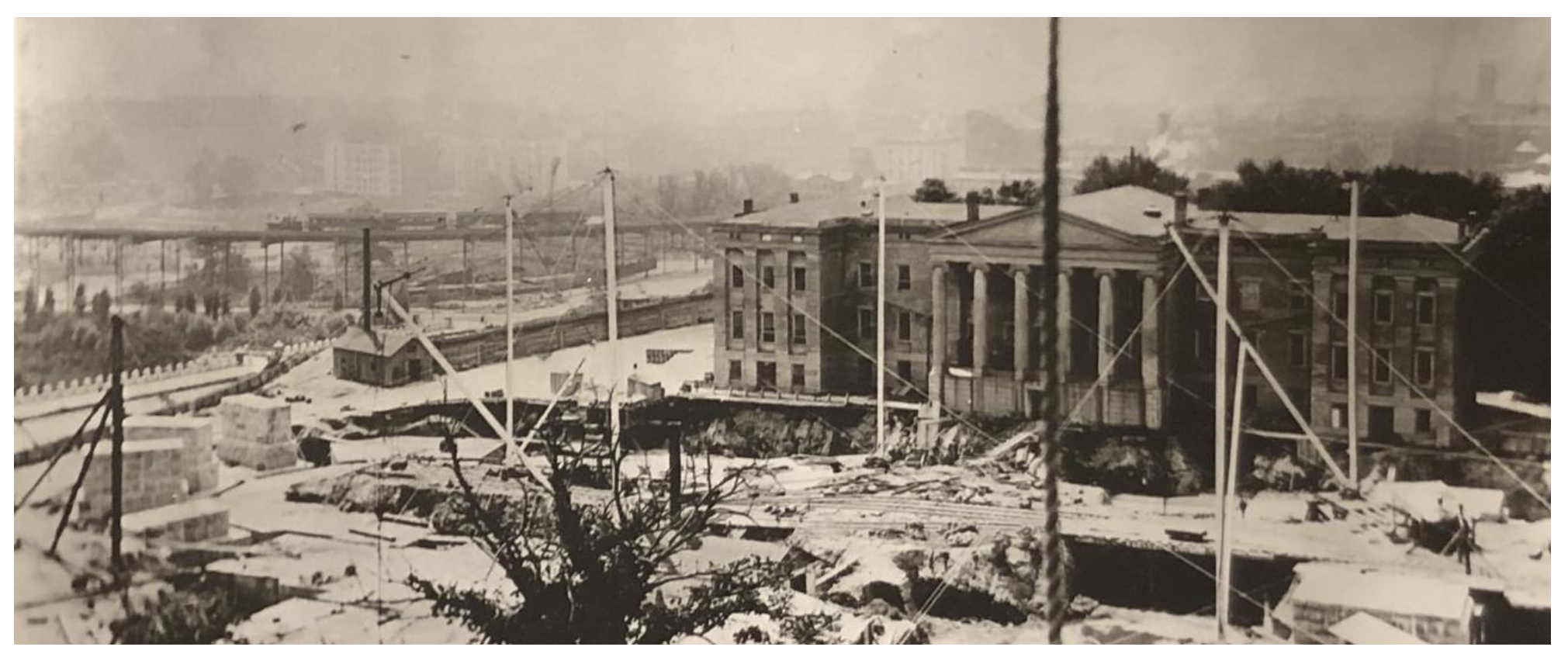 The construction site of St John the Divine in 1895. The building shown here is the Leake and Watson Orphan Asylum, purchased for the cathedral in 1887.