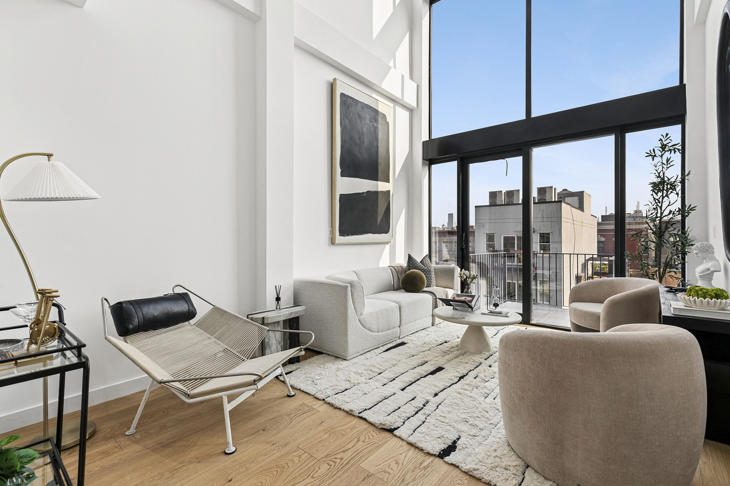 - Cielo (Sky) provides an elevated experience with a sprawling terrace that offers panoramic views of Manhattan. This serene urban retreat allows residents to escape the city’s hustle while staying connected to its iconic skyline. Cielo features multiple balconies that invite natural light and fresh air into every level. The home’s private elevator adds a touch of convenience and luxury, seamlessly connecting each floor. The living room boasts soaring 25-foot ceilings,
