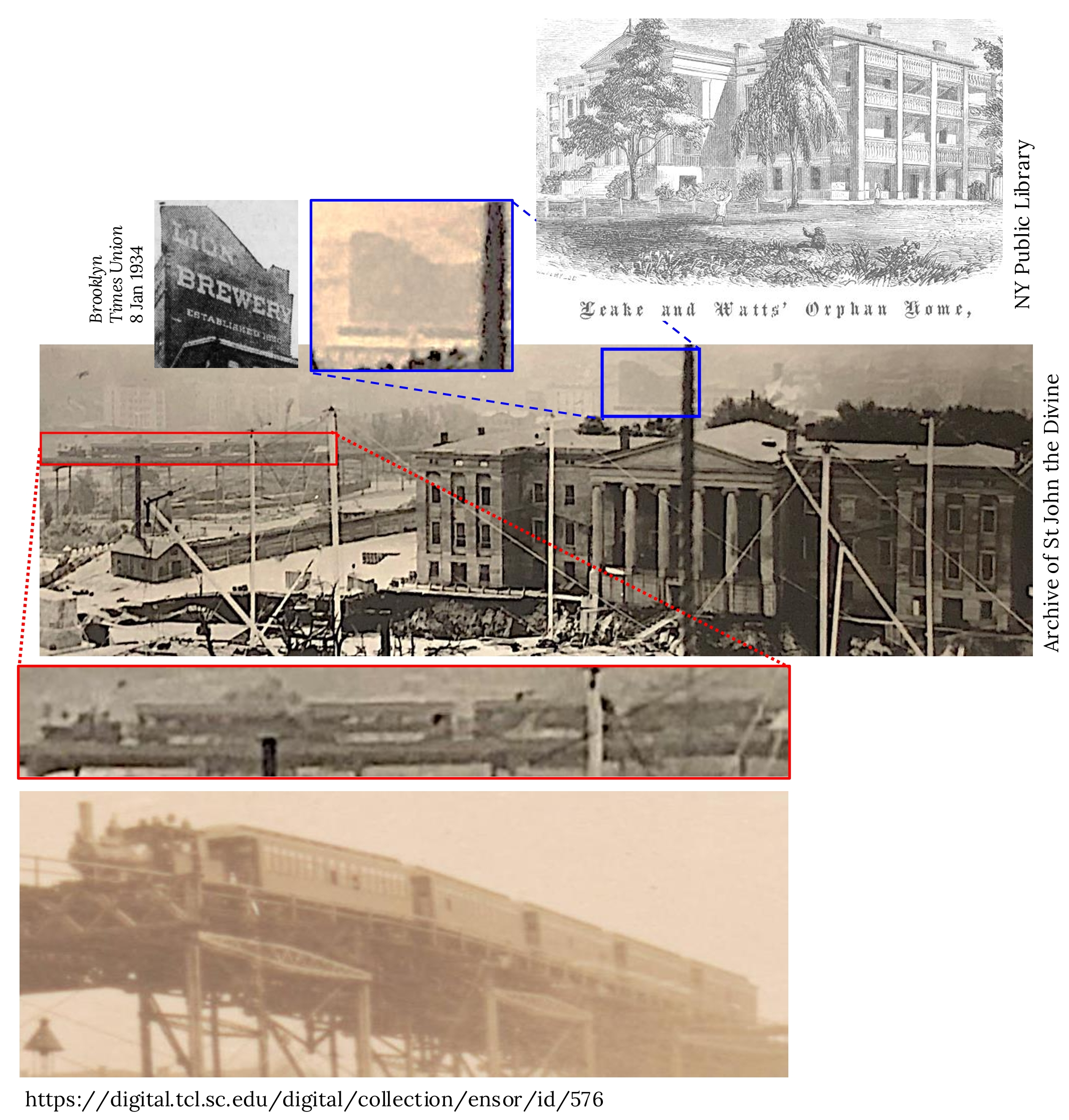 The rest of the story: There is a lot going on in this rich image. The Leake and Watts orphanage opened in the 1840s—it’s probably the oldest extant structure in Morningside Heights. The orphanage moved to Yonkers after the Episcopal Church bought the land for the cathedral in the late 1880s. One of the orphanage building’s two symmetrical wings was removed in 1950, purportedly to allow more space on the crowded campus—the Close. Ithiel Town, after whom the building is now named, was a person and not a place! He designed Federal Hall downtown, among many significant buildings and bridges. You might also have noticed the elevated railroad—this was the 9th Avenue El, which stood until 1940 and made two sharp curves at 110th Street, where it was the highest point in NYC’s rapid transit system. If you look closely at the train that is passing in the photograph, you’ll notice that it’s pulled by a locomotive—this was a steam train, not an electrified system. And the very sharpest of Rag readers may have caught the distinctive trapezoidal shape of the Lion Brewery.