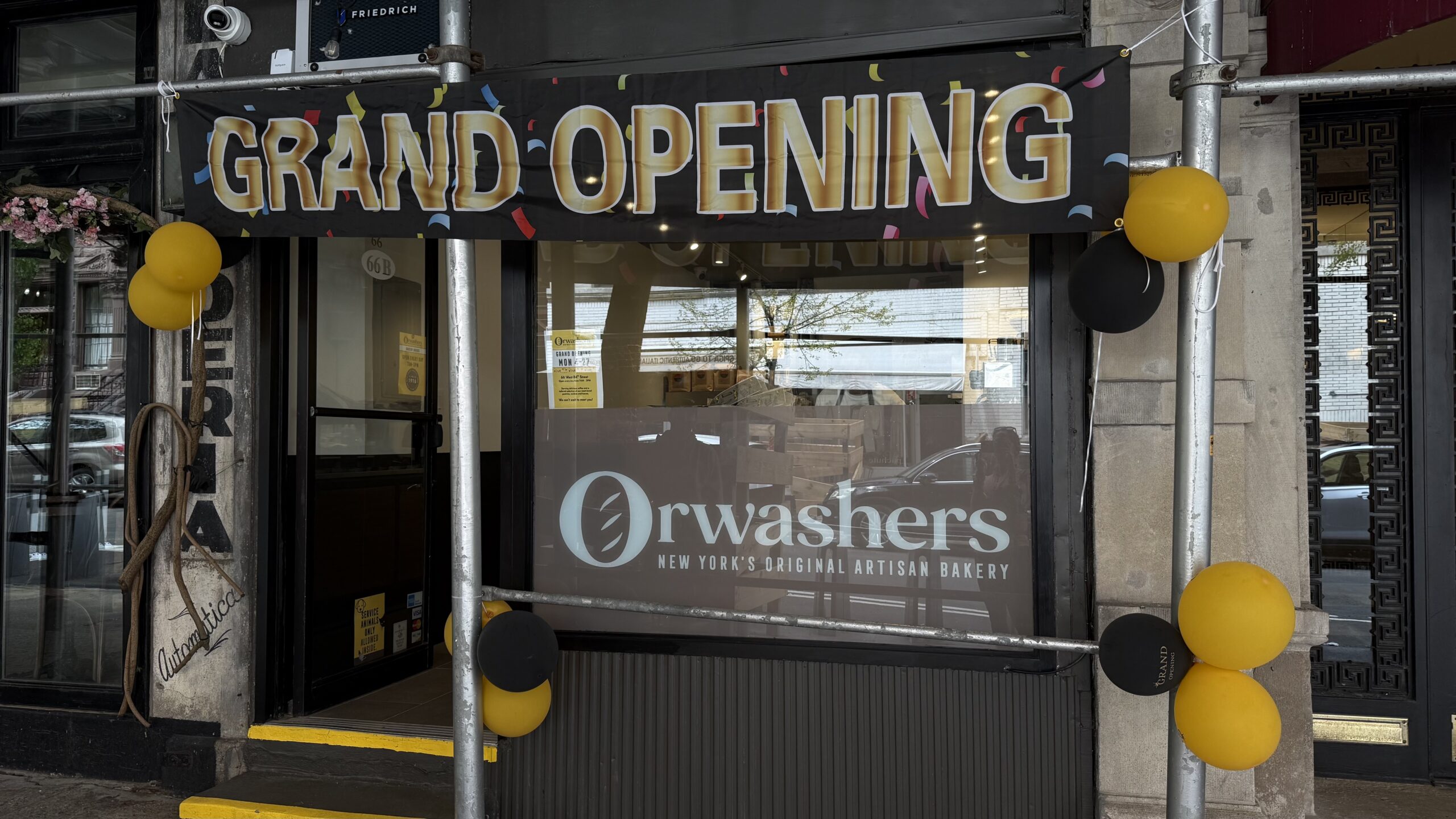 Orwashers, the popular artisan bakery, opened an outpost at 66 West 84th Street (between Columbus Avenue and Central Park West), on April 27th. The outpost sells coffee, pastries, cookies, and loaves and is for takeout only. It sells bagel sandwiches, but does not offer lunch sandwiches or eggs, the manager told West Side Rag. All coffee is from Jack’s Coffee, with which Orwashers has a partnership. Current hours are daily from 7 a.m. until 3 p.m. Orwashers opened at 440 Amsterdam Avenue in 2016. The bakery also has locations on the Upper East Side, Long Island, and at various farmers markets. The space was previously used for storage by neighboring wine bar, Vin Sur Vingt.